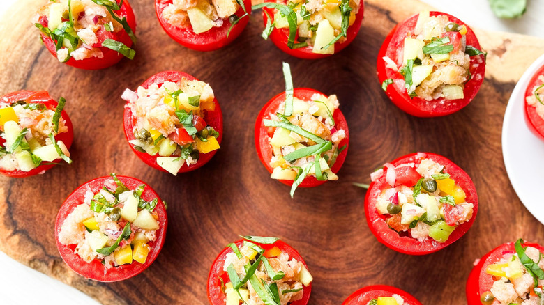 If you haven't tried panzanella before, it is much more delicious than the ingredients might make it sound. Stale bread soaked in vinaigrette and tomato juices, along with some crunch from fresh vegetables and herbs may sound like an unusual salad, but it makes complete sense once it hits your tastebuds. Panzanella is a very old and classic Italian preparation that is most delicious in the summer months when tomatoes are at their peak of ripeness. Recipe developer Julie Kinnaird gives this classic a twist with her bite-sized panzanella stuffed tomatoes. Flavorful Campari tomatoes serve as the vessels for a panzanella made with cucumber, bell pepper, red onion, and capers. Ciabatta bread makes up the base of the salad, which is given a boost of brightness with fresh basil and mint.