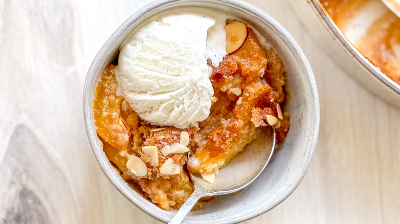 Kinnaird uses blanched almond flour in the cobbler dough, which not only makes this recipe gluten-free but also gives it a nice texture and nutty flavor. The texture of the topping is as tender and crumbly as that made with regular flour, so this recipe will appeal to everyone, whether or not they're searching out gluten-free dishes. The cobbler is flavored with cinnamon, nutmeg, and cardamom, and lemon zest gives a bit of brightness. Brown sugar sweetens the dessert and adds a nice hint of caramel. Slivered almonds and a sprinkle of turbinado sugar give this cobbler topping an additional crunch.