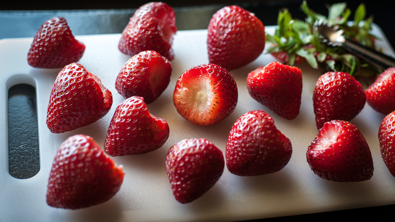 Once you know how to hull strawberries with ease using your vegetable peeler, you're well on your way to crafting bakery-level showstopper desserts and striking sliced fruit and walnut salads. To preserve the moisture and vibrant color of ripe strawberry slices stacked on top of cakes or tarts, apply a light layer of simple syrup atop the fruit as a glaze. For baked fruit pies, sprinkle a little sugar on top of the fruit before you place your pastry in the oven, so the berries become glistening and extra sweet.