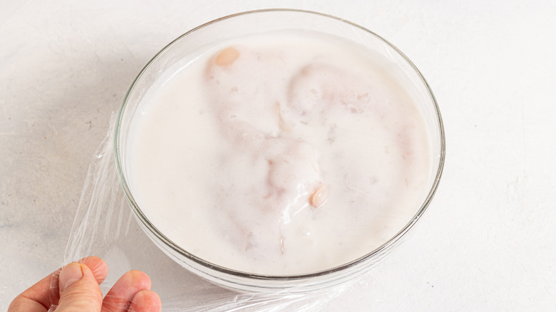 - Place the chicken in a bowl and add the coconut milk. Cover with plastic wrap and move to the fridge for at least 1 hour.