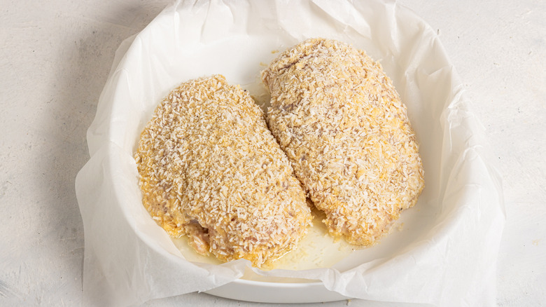If you plan to use them within a few days, cover the coated chicken breasts tightly with plastic wrap or aluminum foil and refrigerate. They can be stored in the refrigerator for up to 24 hours. When ready to cook, preheat the oven or air fryer, and bake or air fry the chicken breasts according to the original recipe instructions. If cooking from frozen, you may need to add a few extra minutes to the cooking time.