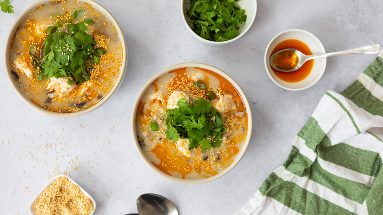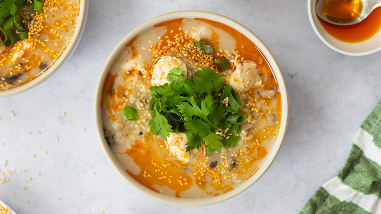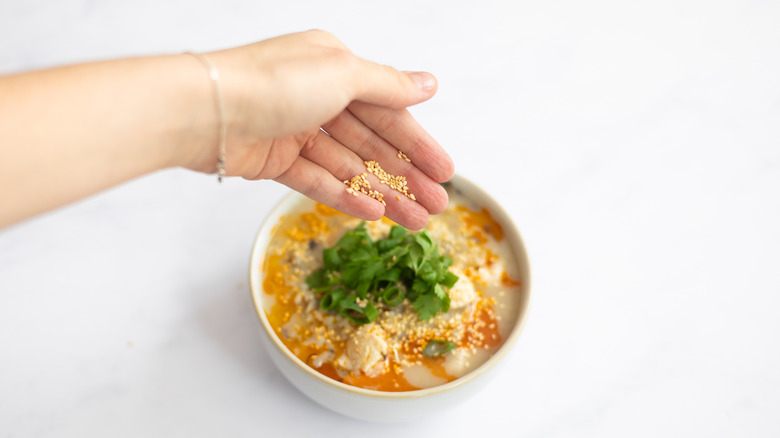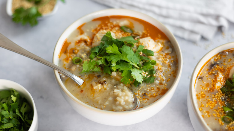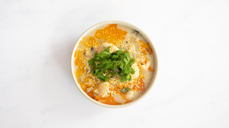 - Garnish the congee with chlli oil, scallions, coriander and toasted sesame seeds.
