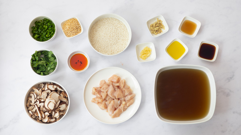 To create this comforting ginger chicken jook, you will need: sesame oil, vegetable oil, shiitake mushrooms, garlic, ginger, chicken stock, soy sauce, short-grain rice, chicken breast, chili oil, scallions, coriander leaves, and sesame seeds.