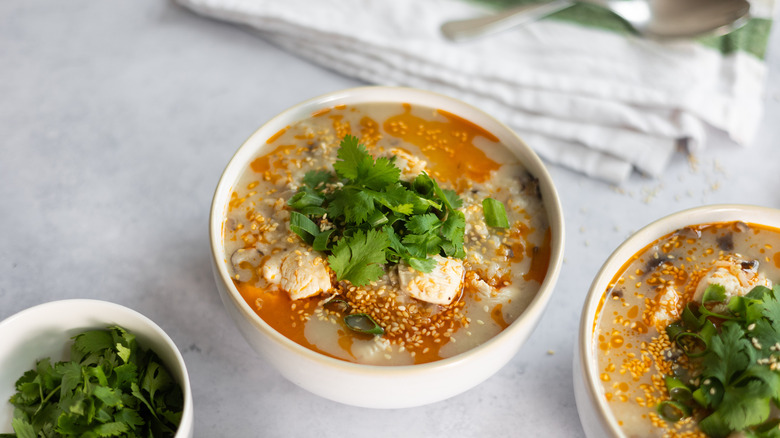 - Turn off the heat, and spoon the chicken congee into the serving bowls.