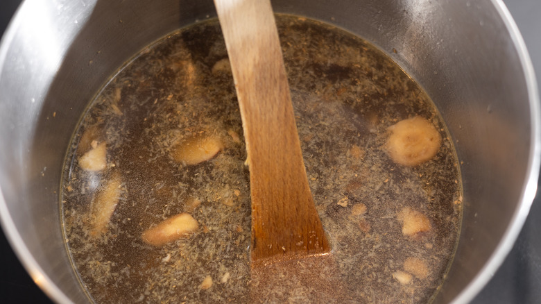 - Pour in the chicken stock and soy sauce, and bring to a boil, then turn down to a simmer.