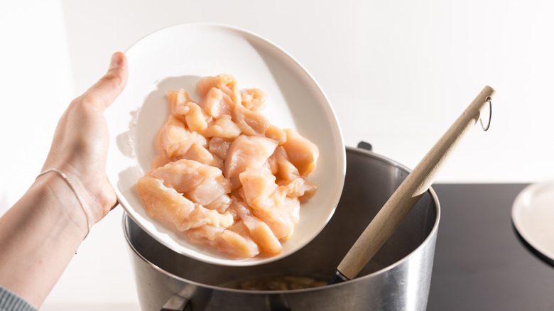 - Add the chicken and allow it to poach for 2 minutes or until cooked through.