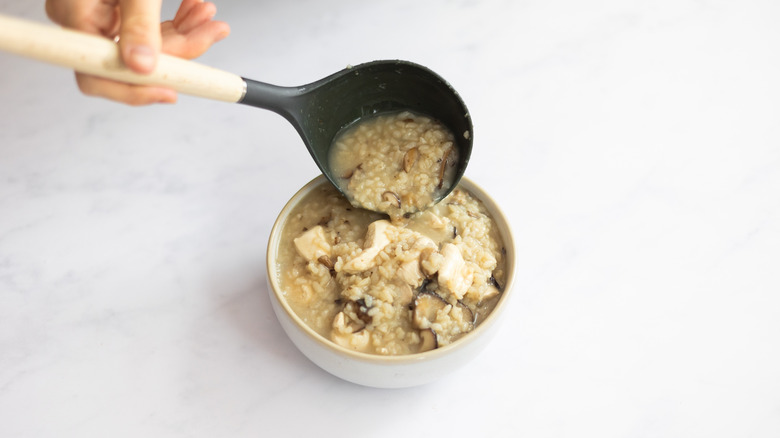 Turn off the heat, and spoon the chicken congee into the serving bowls.