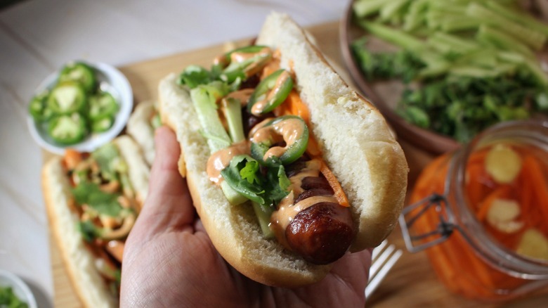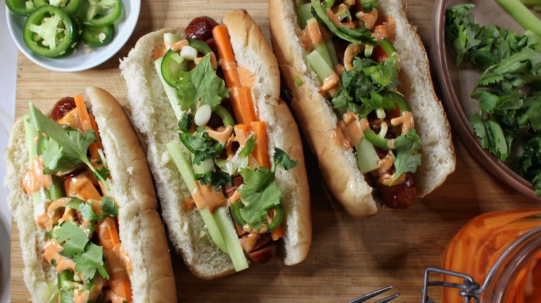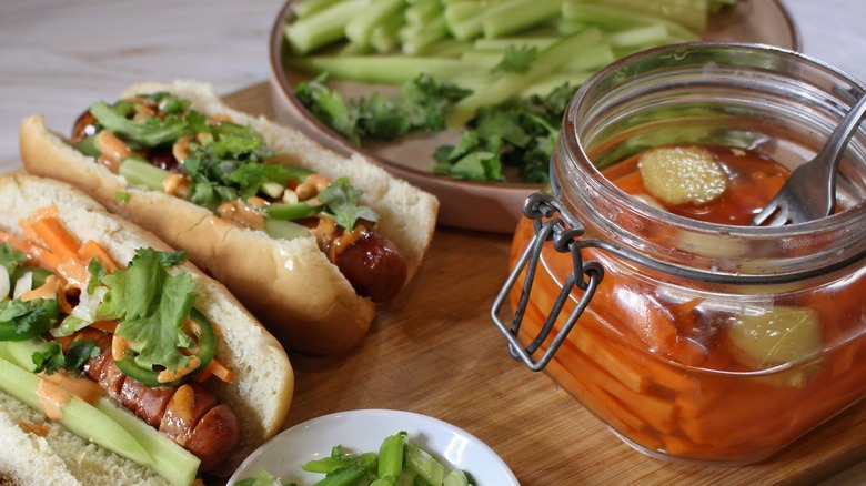 - Place each hot dog on a roll and garnish with pickled carrots, cucumber, jalapeno, scallions, cilantro, and sriracha mayo.