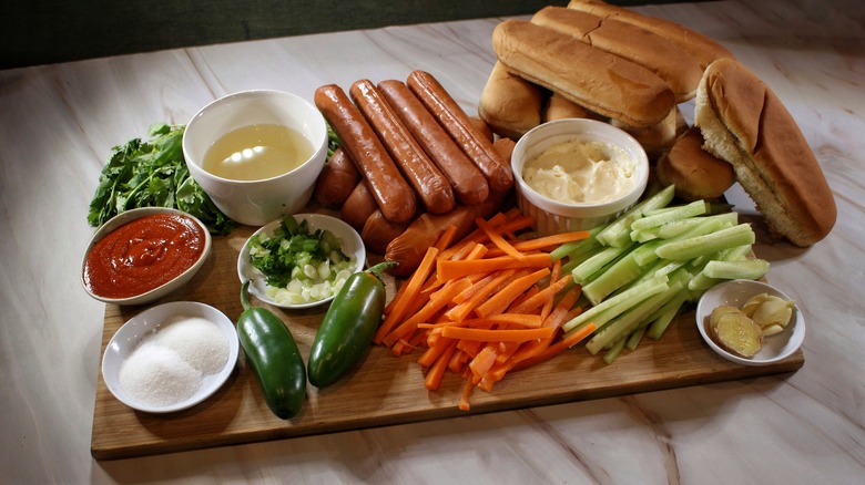 In this recipe you will not only be making beautiful, crisp, spiral-cut hot dogs, but also quick-pickled carrots to add acidity and crunch, as well as a sriracha mayo to drizzle over the top. Before you start cooking you need to gather the hot dogs, buns, cucumber, jalapenos, scallions, cilantro, mayonnaise, sriracha, rice vinegar, salt, sugar, ginger, and garlic.