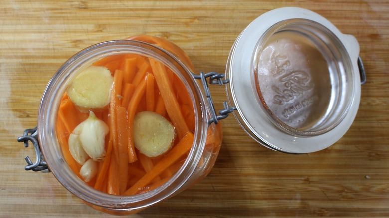 - Place the carrots, garlic, and ginger in a heat-safe container and pour over the hot brine. Set this aside for now.