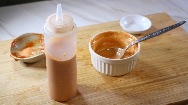 If you too have fallen victim to the sriracha shortage, don't worry, there are other options out there. The Huy Fong brand is certainly the most familiar variety of sriracha, coming in that famous clear bottle emblazoned with a white rooster and topped with a bright green cap, but if you can't find that flagship at your local market, there are other brands out there. Particularly after the 2022 crop failure of the red jalapenos on which Huy Fong relied, many other hot sauce makers stepped in to fill the void in the market. While each brand has a slightly different recipe and flavor, and the Huy Fong brand is still king, any brand can be used in this recipe. You might just want to tweak the seasoning a little bit if you choose another brand. Sweetness tends to be the largest area of variation in sriracha recipes, so depending on which way your bottle leans, a pinch of sugar or salt will likely get you closer to that familiar taste.