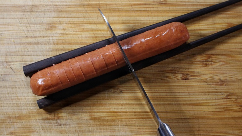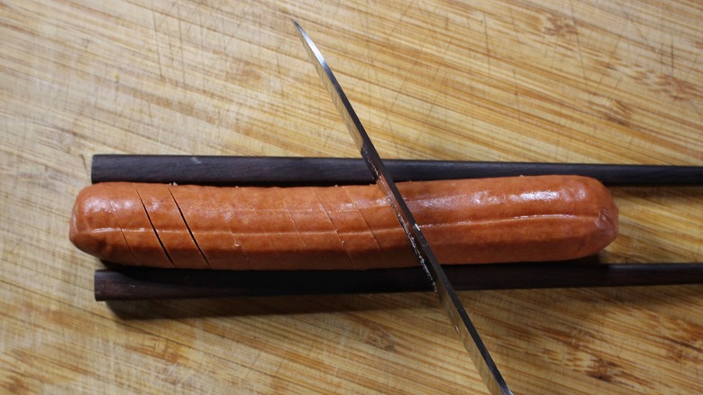 - To spiral-cut the hot dogs, place them on a cutting board and slice crosswise every ¼-inch. Aim to slice only halfway through with each cut. You can place chopsticks on the sides to keep from cutting too deep.