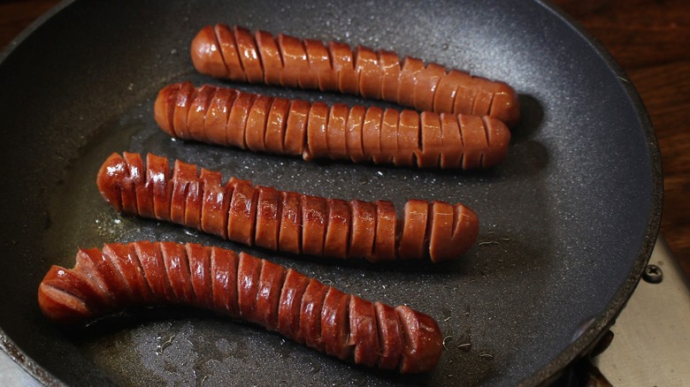 - After you've sliced one side, flip the hot dog over and repeat, except this time slice at a 45-degree angle. Once sliced as such, the hot dog should remain in one piece and have a nice spiraling, slinky-like cut.