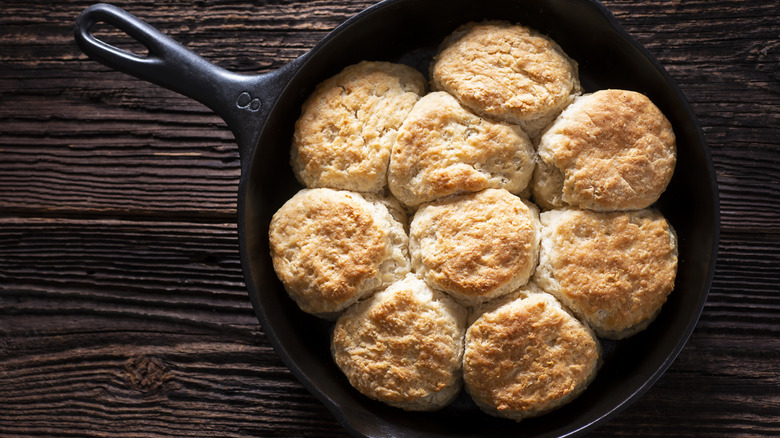 Along with crowding your biscuits close together in their pan or skillet, there are a few other actions you can take to ensure your biscuits tower over everything else on the plate. If you're making biscuits from scratch, make sure your ingredients are as cold as possible when assembling your dough — especially the butter. Throwing together a rough dough with still-visible chunks of butter will help prevent overmixing and will result in a taller, fluffier product.
