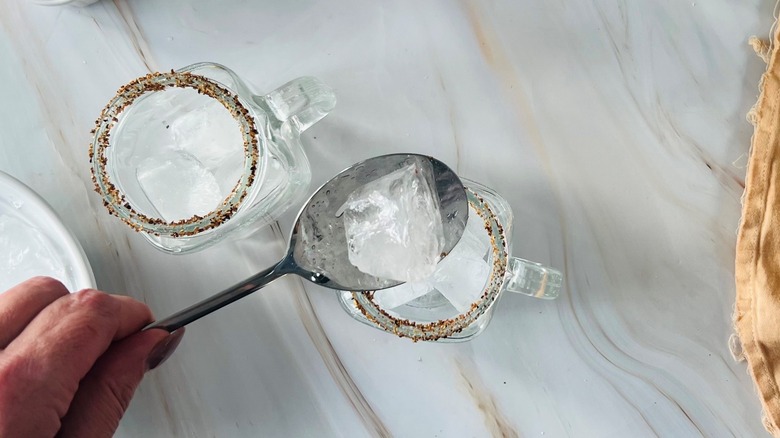De Witt makes these micheladas from Clamato, lime juice, Tabasco, Worcestershire sauce, and a Mexican lager beer. She also uses ice cubes to chill the drinks and pours them into glasses rimmed with Tajin.