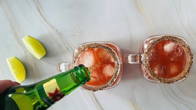 The michelada, some say, dates back to the early 20th century, while others claim it only goes back as far as the 1960s. No matter its provenance, this simple beer cocktail is still pretty popular in both its native Mexico and the U.S. While developer Julianne De Witt admits that "there are a few different versions of this recipe," including variations made with tomato juice, bloody Mary mix, or simply beer, lime juice, and hot sauce, she likes to make hers with the slightly briny Clamato.