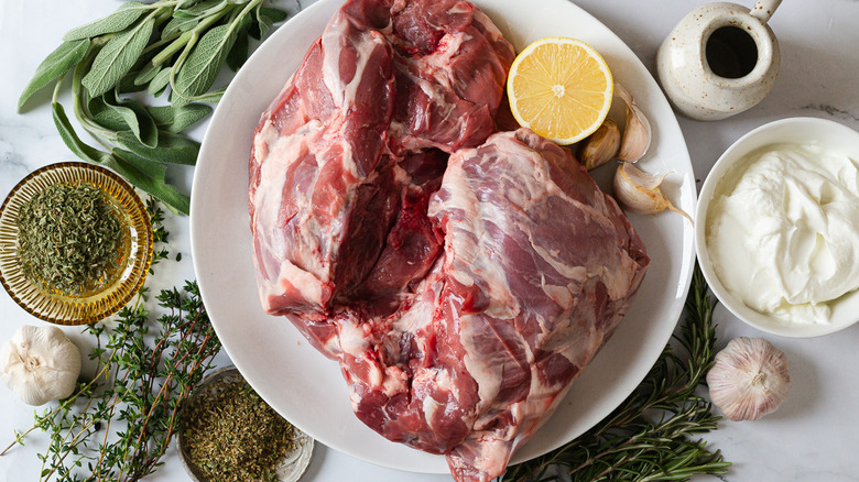 Prepare to cook your roasted leg of lamb by collecting all the ingredients necessary for this flavorful dish. Your shopping cart should include plain Greek yogurt, which serves as the base for a tangy marinade, alongside fresh lemon for both zest and juice to add a citrus note. We will need a few heads of garlic, both for minced cloves for the marinade, and for roasting alongside the lamb. Herbes de Provence, dried thyme, and dried sage contribute an aromatic herbal profile to the dish. The main attraction, a boneless leg of lamb, will be complemented by olive oil, kosher salt, and freshly cracked pepper for proper seasoning. To decorate the dish, we turn to fresh thyme, sage, and rosemary, which will contribute freshness to the meat as it roasts to perfection.