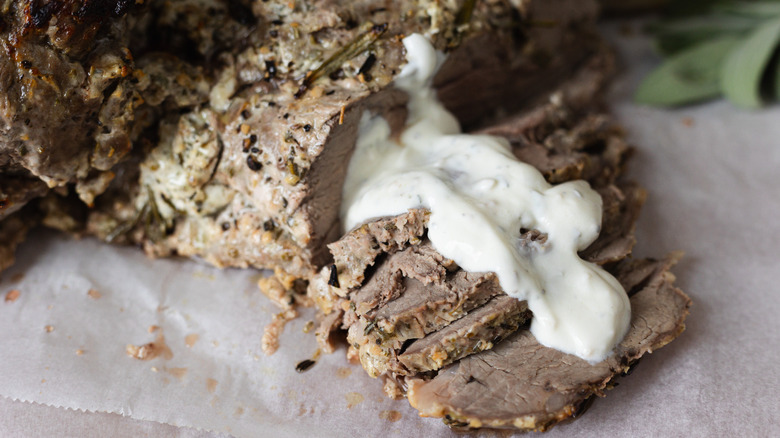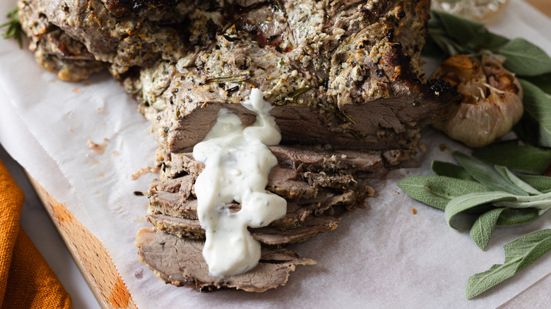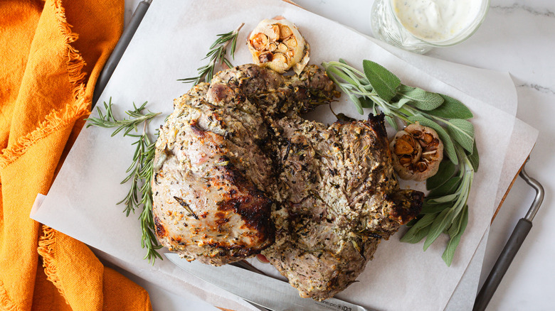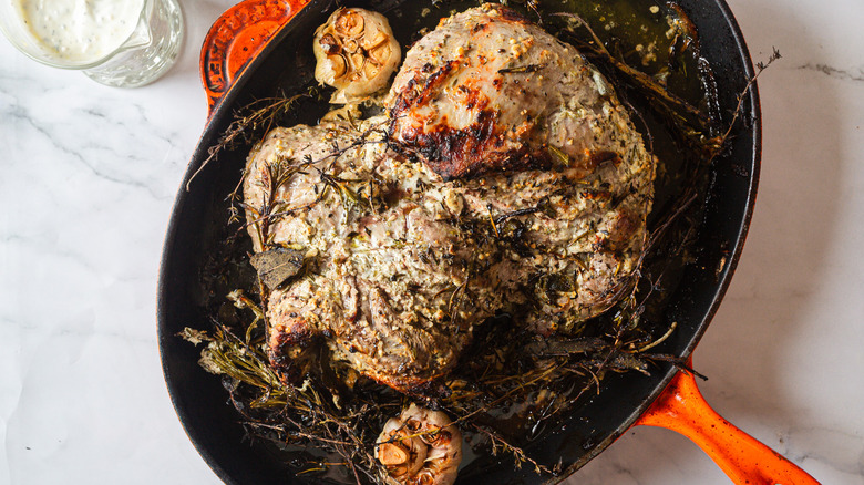 Accompanied by homemade yogurt-herb sauce, this roasted leg of lamb offers straightforward, punchy flavors allowing the lamb's natural flavors to shine through.