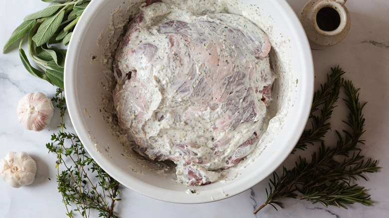 - Prepare the Marinade. In a bowl, combine yogurt, zest and juice of one lemon, minced garlic, dried Herbes de Provence, dried thyme, dried sage, salt, and black pepper. Mix well to create a smooth marinade.