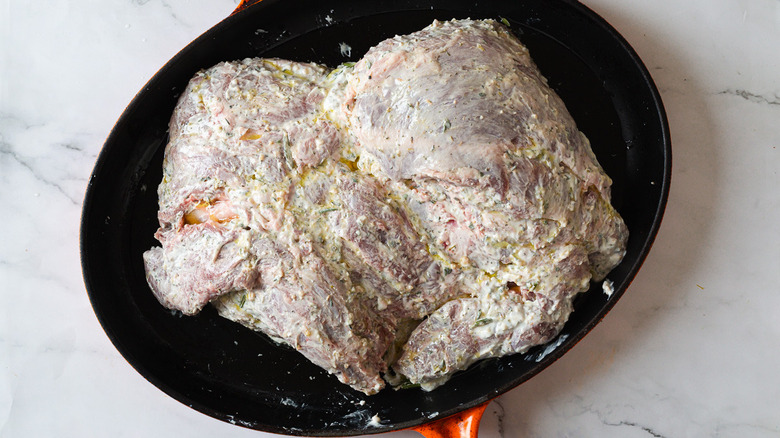 According to Ksenia Prints of At the Immigrant's Table, a boneless leg of lamb can be the perfect centerpiece to a festive meal. We turn to the tenderizing qualities of Greek yogurt to make a marinade that makes this meat especially moist, working through all of its knots and crevices and infusing it with mountains of flavor. Fresh and dried Herbes de Provence, thyme, rosemary, and sage join garlic for the perfect flavoring, going beautifully with the Mediterranean theme of the whole dish.