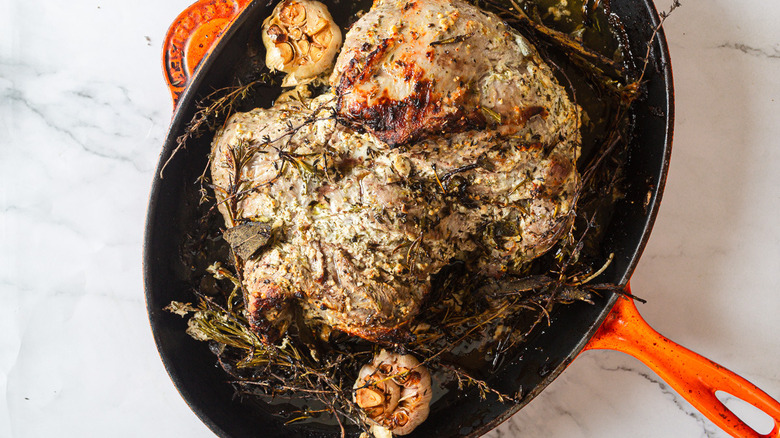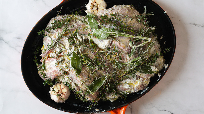 Top the lamb with olive oil, marinade leftover in the bowl, garlic heads, and fresh sage, thyme, and rosemary.