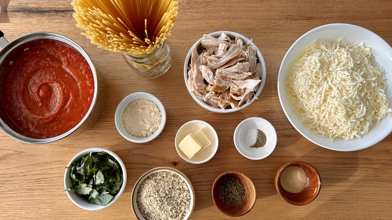 Collect the ingredients for this cheesy chicken Parmesan spaghetti bake