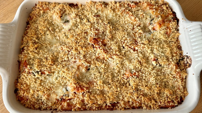 If you want to make a few tweaks to this casserole recipe, Rosenhouse says that's perfectly okay with her as she feels that "this dish is totally customizable." For starters, she says that you can use any kind of pasta you like — either long and thin or short and chunky varieties will work. She does, however, recommend that you subtract 1 or 2 minutes of cooking time from the one provided on the box since the pasta will soften up further as it bakes in the sauce.