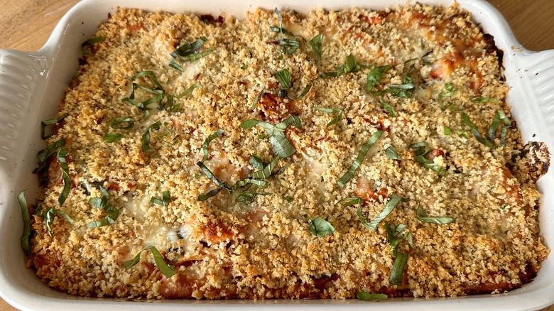 If you order chicken Parmesan in a restaurant, it might come with a side of spaghetti marinara. This casserole, however, combines both elements in a spaghetti bake that, according to recipe developer Katie Rosenhouse, "comes together quickly for a hearty dish that will serve a crowd," although it also makes for good leftovers if you won't be feeding large numbers of people. The difficulty level is minimal, too. As Rosenhouse tells us, "If you can boil spaghetti, you can prepare this recipe."