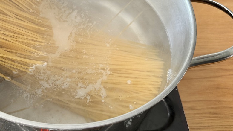 Step 6: Put half the spaghetti in a pan