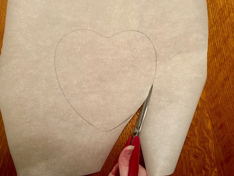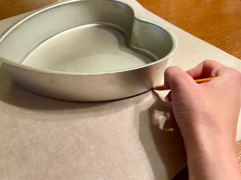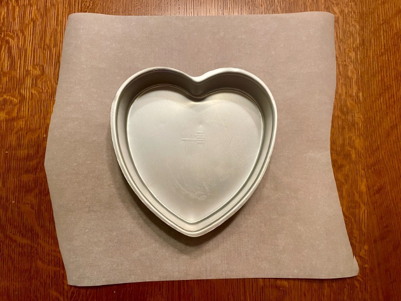 If you have an awkwardly-shaped pan, such as a heart, cut a piece of parchment paper larger than the pan itself. Place the pan onto your cut piece.