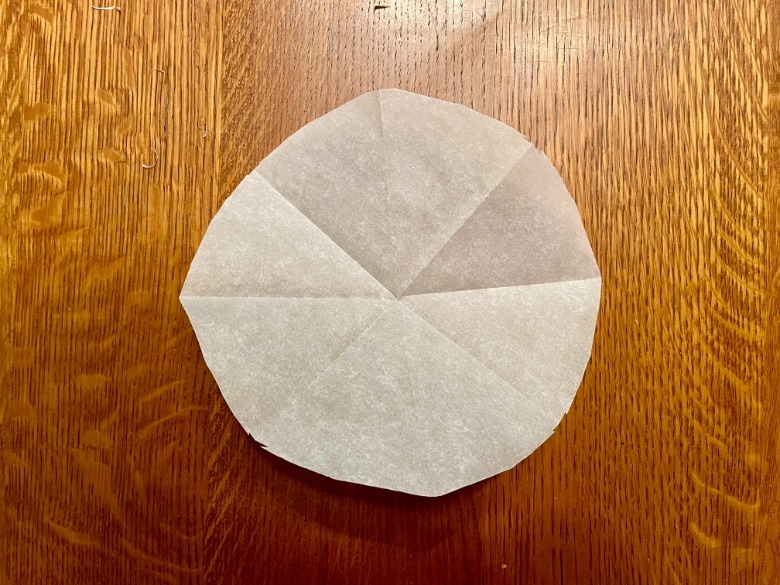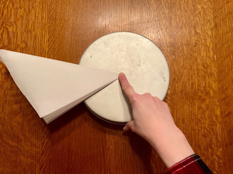 Place the pointed end of the triangle where all the folds meet in the center of your overturned round pan so that the edge of the paper extends over the edge of the pan.