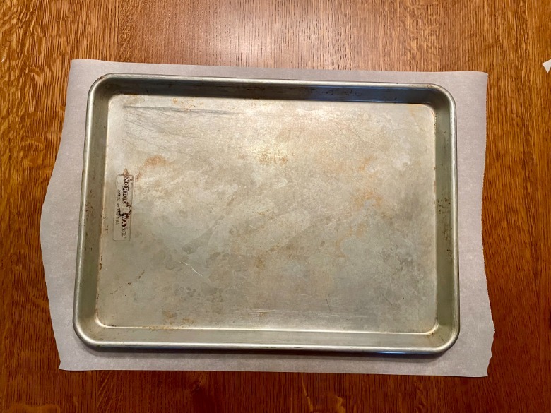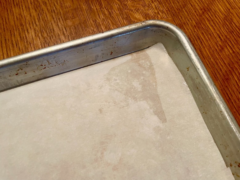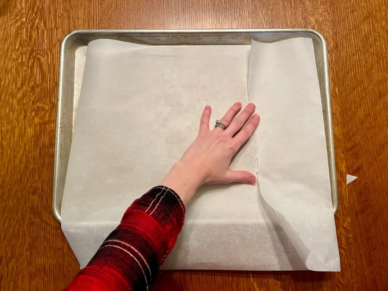 Pick one corner of your baking sheet and line up the length and width of one side of the parchment paper. Fold over any excess parchment paper along the short end of the pan and crease.