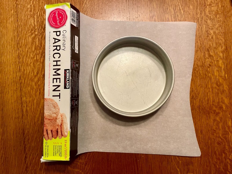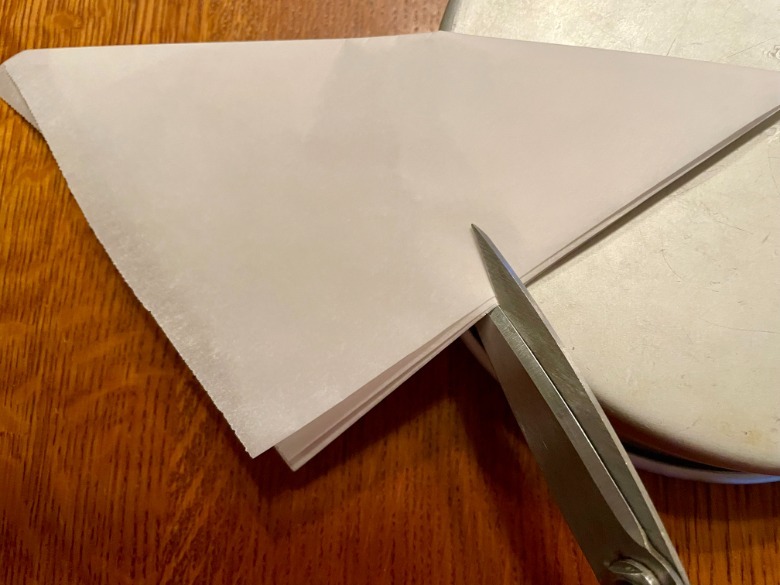 Discard excess parchment paper. Unfold your triangle to form a circle. Place the circle in your pan. If you find the circle is too large, fold it back up and trim the edge until the desired size is reached. Grease the pan to ensure the parchment sticks and does not roll up.