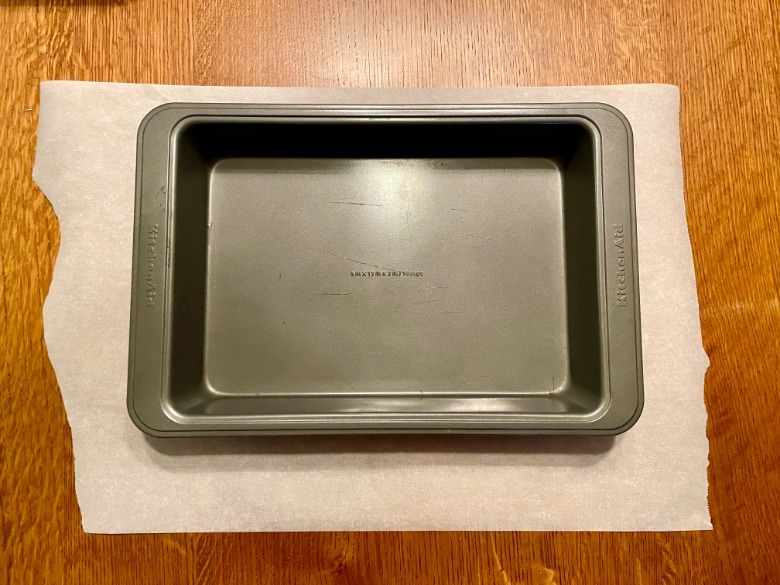 Roll out a piece of parchment paper that is longer in both length and width than your pan.