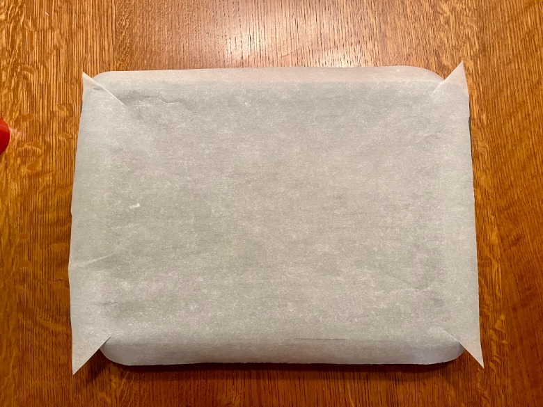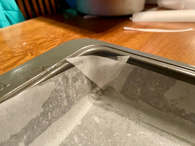 Place your parchment in your pan and press down. The corners will create two triangles. Layer one on top of the other to create a flush corner.