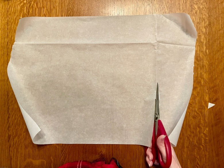 Do the same with the long end. Unfold your parchment paper. The parchment paper will now have creased lines the exact size and shape of your pan. Cut along the lines.