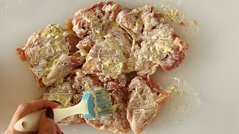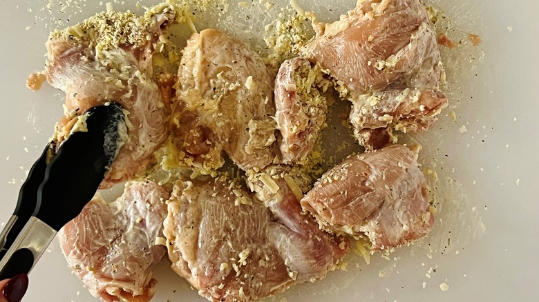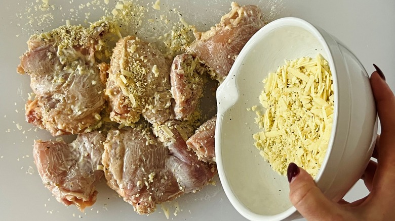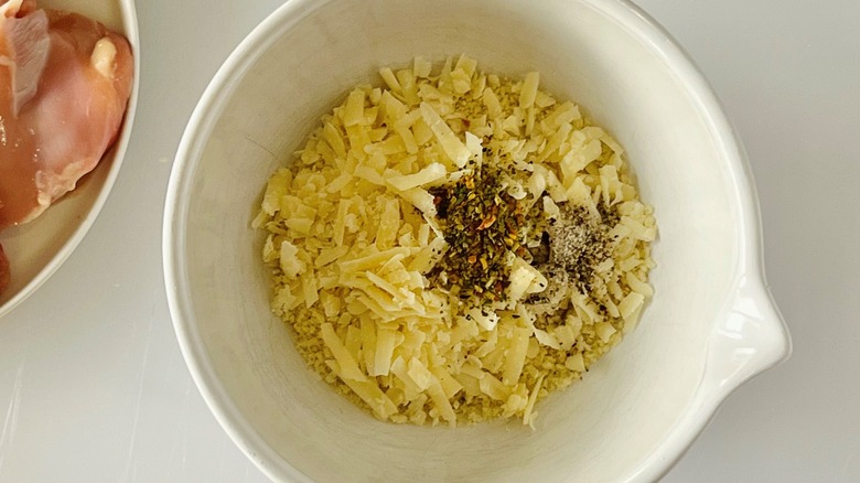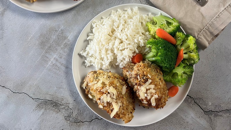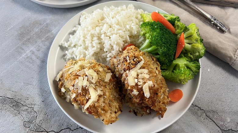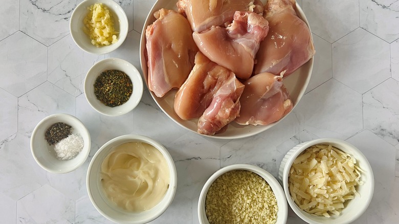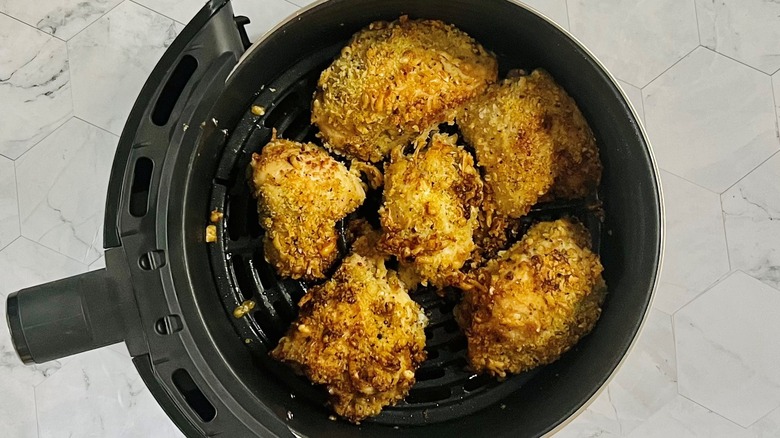 For this recipe, you'll need mayonnaise, minced garlic cloves, salt, freshly ground black pepper, Italian seasoning, boneless skinless chicken thighs, panko breadcrumbs, and grated Parmesan cheese. De Witt notes, "Bone-in chicken thighs or drumsticks would work as well, but they take longer to cook, so adjust the cooking time accordingly." However, take note that she advises against using chicken breasts: "I normally avoid cooking boneless breasts in the air fryer because they tend to get tough."