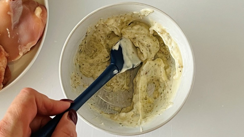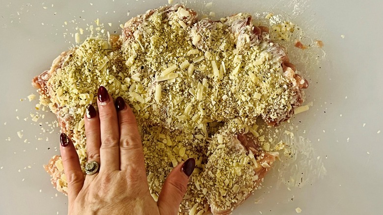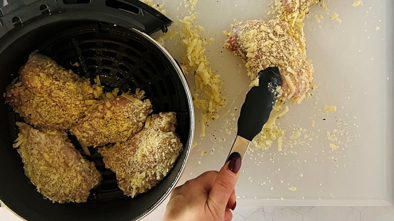 Although an air fryer requires less of a hands-on approach than deep-frying, there are a few ways to guarantee success. De Witt's recipe provides the optimal balance of wet and dry ingredients to ensure the chicken doesn't dry out. As she explains, "The mayonnaise helps to keep the chicken moist and tender." By creating a wet coating between the chicken and breading, the juiciness is sealed into every bite.
