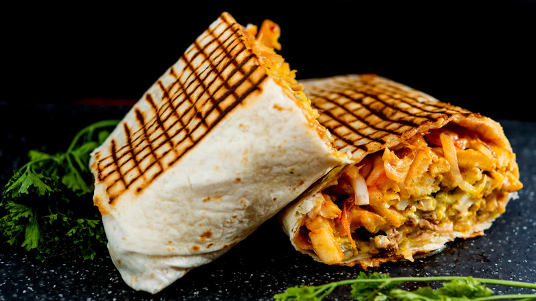 Rather, the French tacos (yes, they're always written as a plural, even if you're referring to just one) are a fast food lover's delight: A wheat tortilla stuffed with various combinations of meat, cheese, and sauces. Vegetables are not particularly common unless you're ordering a vegetarian version. In a pinch, you could argue that they're a variation on a burrito since they're a filled, wrapped-up tortilla, but the similarities are mostly in the shape and form of the dishes, not the fillings. Fillings for French tacos typically lean greasy, such as ground beef, sausage, and chicken nuggets or tenders. There's usually a solid helping of cheese: If you order one in France, you'll likely get options like goat cheese, emmental, mozzarella, and cheddar. Classic fast food sauces abound as well, from mayo to barbecue, as well as less-standard choices like Samurai (a spicy mayo-ketchup) and curry sauce. No need to order fries on the side — they're usually put straight into the wrap. It's then heated in a panini press-type appliance before serving.