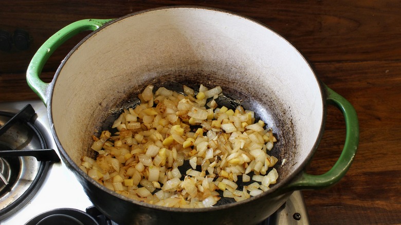 - Add onion, garlic, and ginger and cook for 5 minutes, until ingredients begin to brown around the edges.