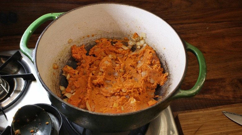 Stir in the pumpkin puree and cook for 5 more minutes until lightly caramelized.
