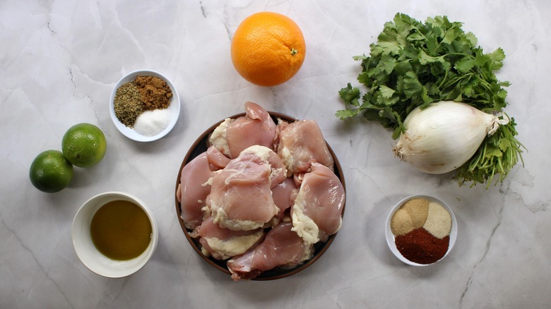 For the chicken in this recipe, you will need olive oil, chili powder, cumin, oregano, onion powder, garlic powder, salt, fresh oranges, and limes, all of which you'll combine to marinate the boneless and skinless chicken thighs. To serve you will also need white onion and cilantro as well as corn tortillas and Mexican hot sauce.