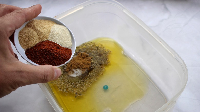 - Add the olive oil, chili powder, cumin, oregano, onion powder, garlic powder, and salt to a large bowl and mix well.