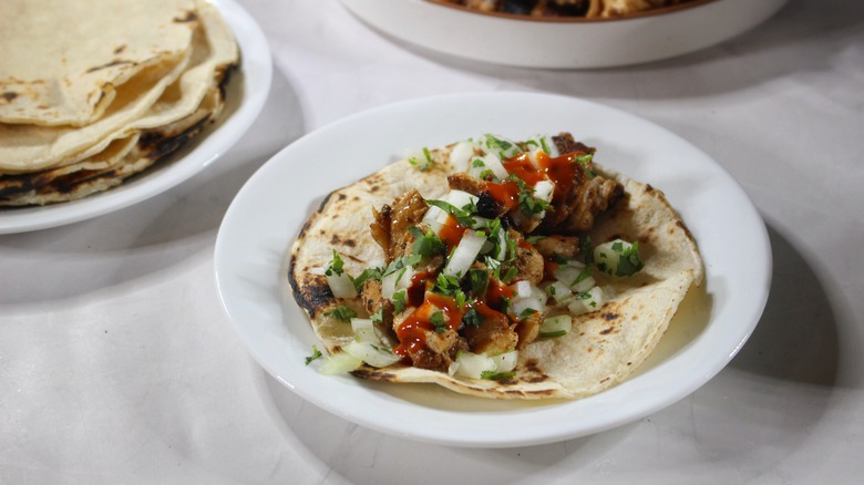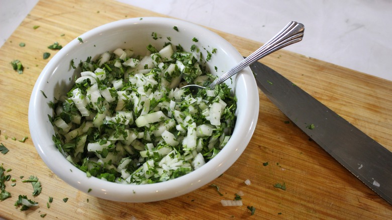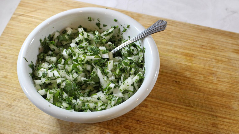 Onions and cilantro serve as the perfect accompaniment to just about any variety of street taco (though if you're genetically predisposed to dislike cilantro, you can skip it). A typical street taco is served as a warm tortilla stuffed with your choice of meat, be it chicken adobado, chorizo, carne asada, or al pastor. While a taco stand may have other condiments, such as sliced or pickled chiles, sliced radishes, or a variety of other options, verdura is the standby. The raw onion adds a pungency that complements the meat, with the cilantro adding a cooling herbal quality.