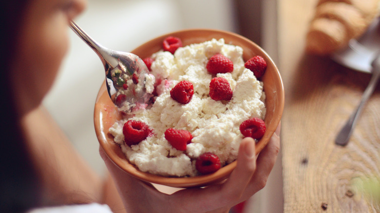 You can also use your sense of smell to determine if your cottage cheese is safe to eat. You might notice a sour or overly tangy smell. If this is the case, it likely isn't good anymore. When in doubt, it's best to throw away cottage cheese that you suspect has gone bad. You may also be tempted to freeze your cottage cheese to make it last longer — but the USDA does not recommend that because it does not freeze well. Just make sure to keep your cottage cheese in a refrigerator set to 40 degrees Fahrenheit to ensure that it stays fresh for as long as possible.