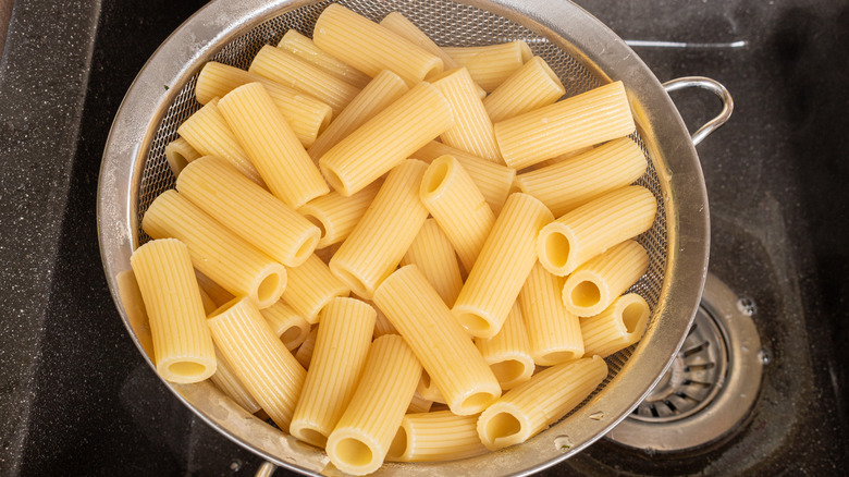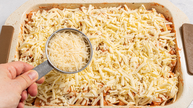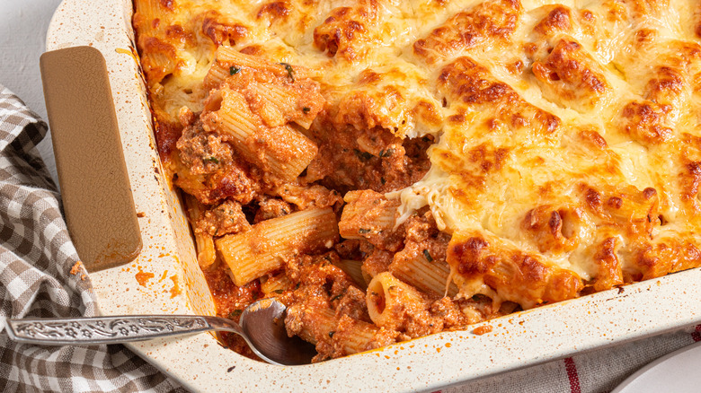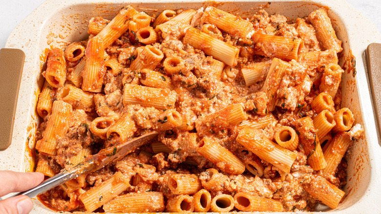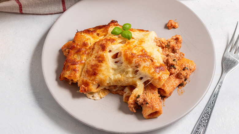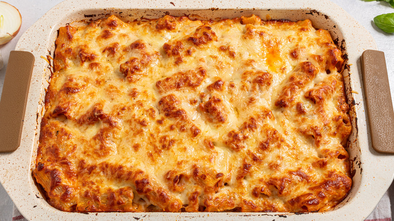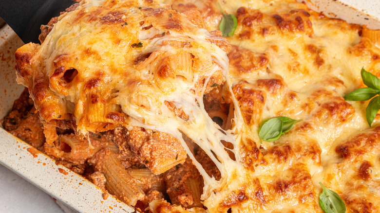 While many baked pasta dishes can be made ahead, classic cheesy baked ziti is not the best dish to prep entirely in advance due to the way the pasta absorbs moisture. What you can do instead is prep some of the components of the dish ahead of time. First, you can make the sauce early and store it in the fridge for up to 3 days. You can instead freeze it for longer — just thaw it before assembling pasta. Next, shred the cheese beforehand and store it in the fridge for up to 2 days, or buy some pre-shredded cheese. Fully cooking the pasta in advance isn't ideal, but you can save a few minutes by parboiling it (cooking it for about half the time) and toss it with a bit of oil to prevent sticking. From there, assemble the dish with the parboiled pasta and bake as usual.