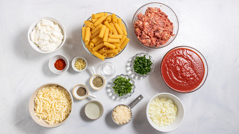 This baked ziti starts with, of course, ziti, rigatoni, or any similar-shaped pasta of your choice. The sauce comes together with vegetable oil, yellow onion, garlic, salt, black pepper, dried oregano, ground Italian sausage, marinara sauce, fresh parsley, fresh basil, and paprika. To make things extra rich and creamy, you'll add ricotta, mozzarella, and Parmesan cheeses.