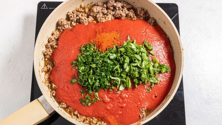 - Stir in the marinara sauce, parsley, basil, and paprika. Cook for 5 minutes, stirring frequently, then remove from heat.