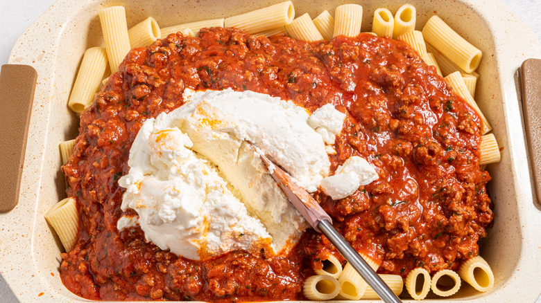 Step 9: Transfer pasta, sauce, and ricotta to a casserole