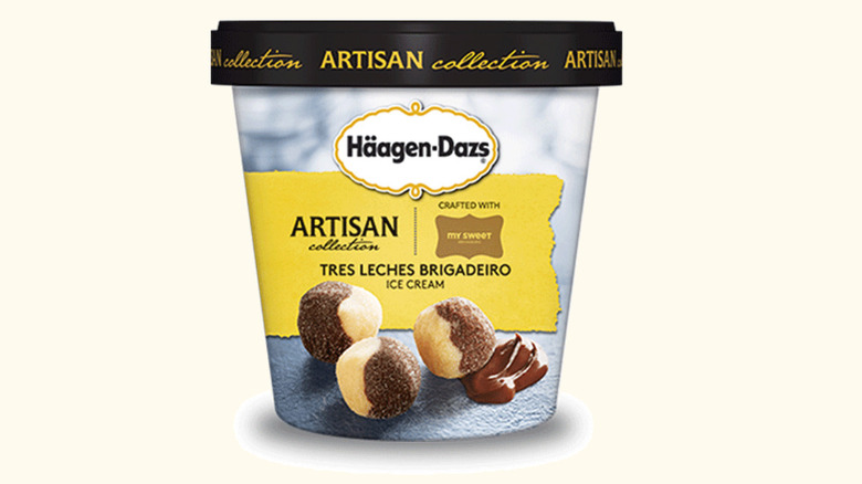 Tres Leches Brigadeiro was an ice cream flavor released by Häagen-Dazs in 2015 as part of their limited-time Artisan Collection. The collection was a partnership between the brand and a handful of confectionary artisans from across the country to create new, elevated flavors that also included Applewood Smoked Caramel Almond, Chocolate Caramelized Oat, and Banana Rum Jam.